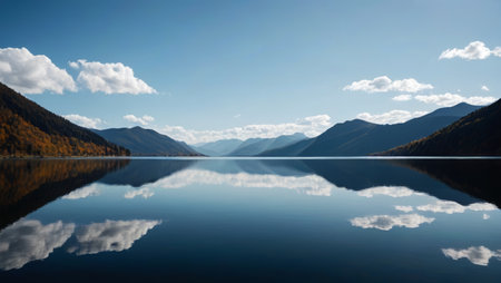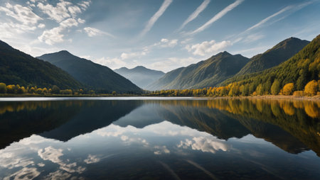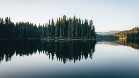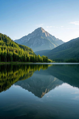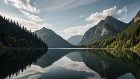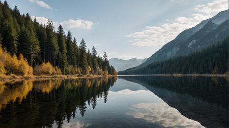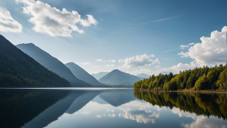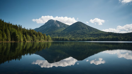 A tranquil lake surrounded by forest and mountains, with a clear reflection of the landscape on the waters surface, creating a peaceful nature background