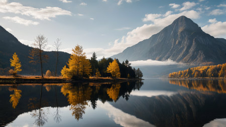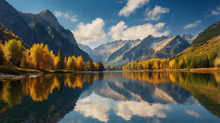 panoramic view of autumn alpine lake with reflection in water