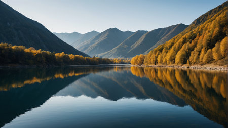 Autumn lake with yellow trees in the mountains reflected in the water