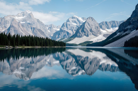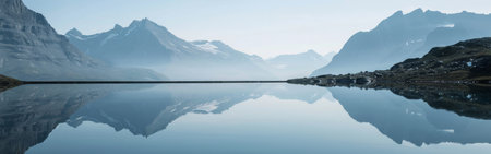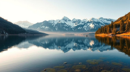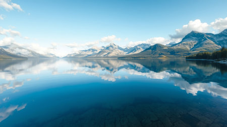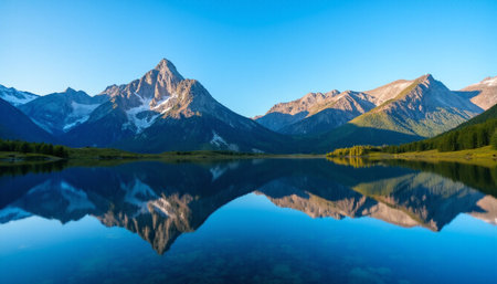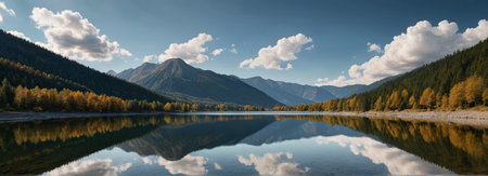 A stunning panoramic view of a serene mountain lake, featuring a pristine reflection of majestic peaks and lush forests under a clear blue sky. This image evokes tranquility, natural beauty, and the grandeur of untouched wilderness