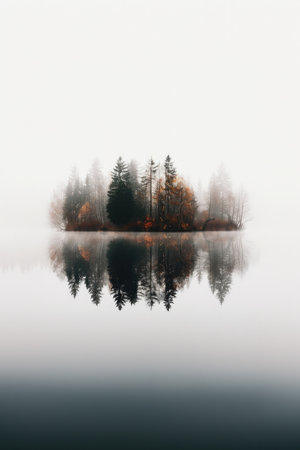 Colorful autumn trees display shades of orange and yellow on a small island in a serene lake, with soft mist creating an ethereal atmosphere during early morning.