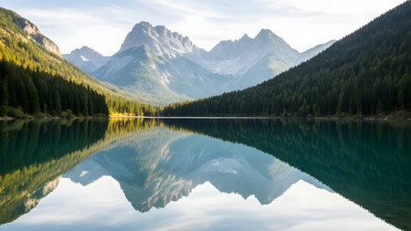 A breathtaking view of a tranquil lake perfectly mirroring the surrounding majestic mountains and dense evergreen forests under a soft, cloudy sky, creating a harmonious and peaceful natural scene.