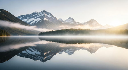 Panorama of a beautiful alpine lake in the morning mist.