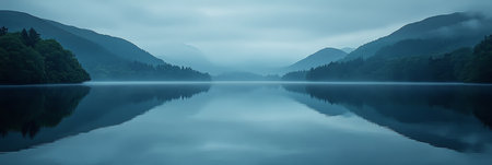 Misty Mountain Lake Reflection, Tranquil Nature Scene With Serene Waters And Atmospheric Mood