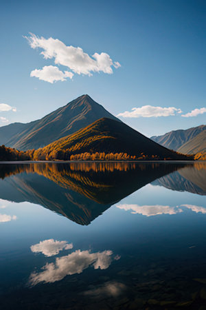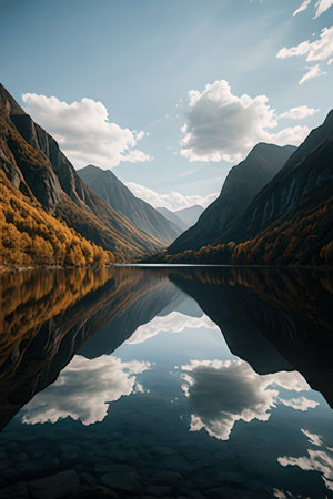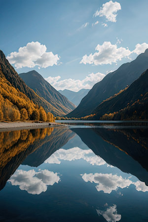Reflection of mountains and clouds in the lake. Beautiful autumn landscape