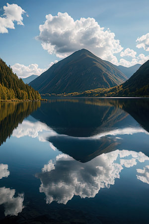Mountain lake with reflection on the surface and blue sky with clouds