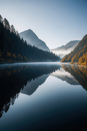 A serene autumn landscape featuring a still lake surrounded by foggy forest, showcasing the captivating beauty of nature in a tranquil environment during a misty day.