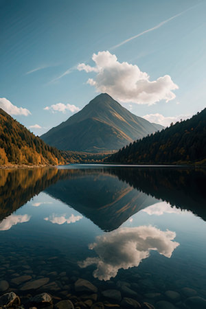 This stunning image captures a serene mountain landscape mirrored in a tranquil lake. The dramatic clouds enhance the scene, emphasizing the beauty of nature.