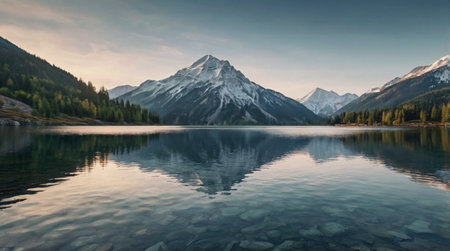 Serene mountain reflection on a calm lake with a cinematic texture in a tranquil landscape