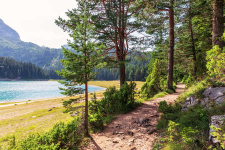 Path in the National park near the Black Lake in the mountains of Montenegro