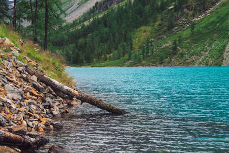 Fallen tree on steep water edge. Vivid landscape with azure mountain lake. Stony shore with rich vegetations of highlands. Flora of mountains. Stony bottom in transparent water. Green mountainside.