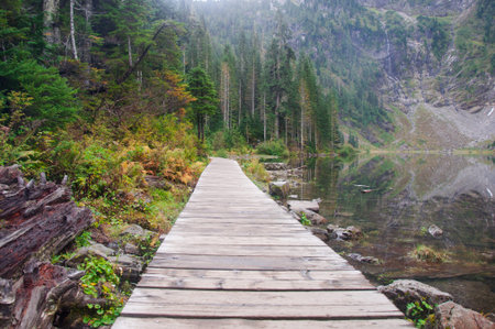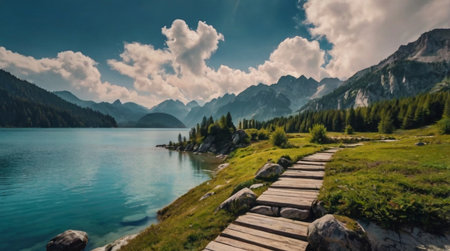 Wooden path to the lake in the mountains. Beautiful summer landscape.