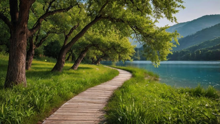 Scenic pathway through lush forest to serene mountain lake under clear sky.
