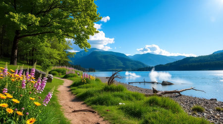 A tranquil sunrise scene over a pristine lake reflecting the majestic mountains. A path winds through wildflowers along the shore, leading to a small cabin.