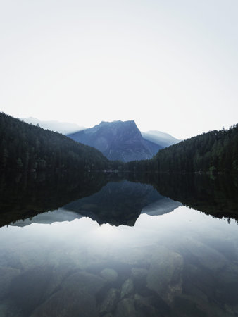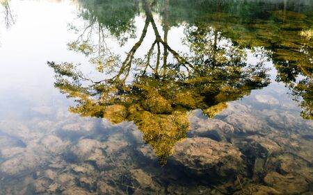 Mirror surface of mountain lake with reflection of stones and trees on shore