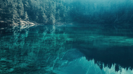 This stunning image features a tranquil lake embraced by a lush forest, set in a misty atmosphere. The calm waters reflect the vibrant greenery, creating a peaceful escape in nature.