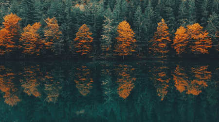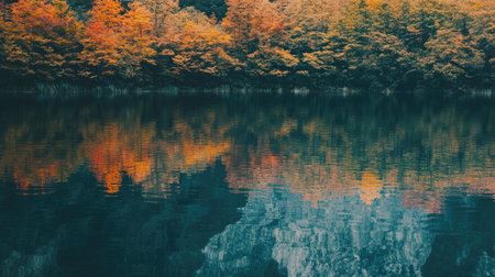 This stunning image captures the serene beauty of autumn foliage reflected on a calm lake. Vibrant colors create a picturesque and tranquil landscape.