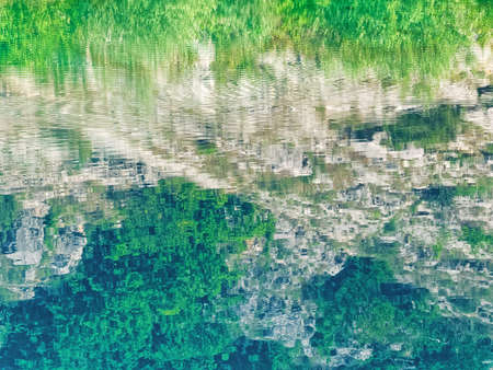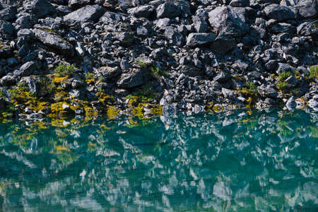 Shiny texture of azure surface of mountain lake. Stony bottom in transparent water. Minimalist background with reflection of mountains in clear water in sunny day. Underwater stones with copy space.