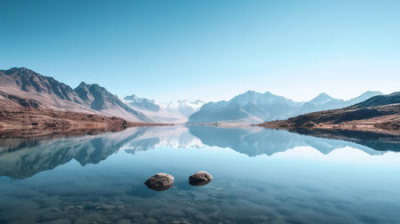 Tranquil lake reflects mountains under a clear blue sky in a serene natural landscape
