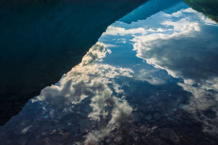 Reflection of mountains and clouds in the lake. Altai, Siberia, Russia