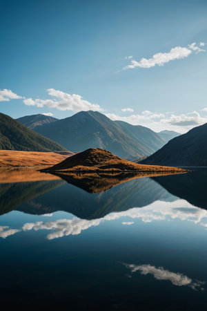 Mountain lake with reflection of the sky and clouds. Beautiful autumn landscape.