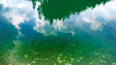 Picturesque lake summer landscape for outdoors vacation. Blue sky and clouds reflection in clear pond water with lush greenery forest in the background.