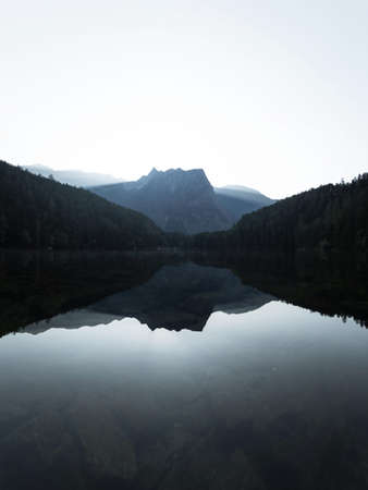 Sunrise panorama mirror reflection view of alpine forest mountain lake Piburger See Oetztal Alps Tyrol Austria Europe