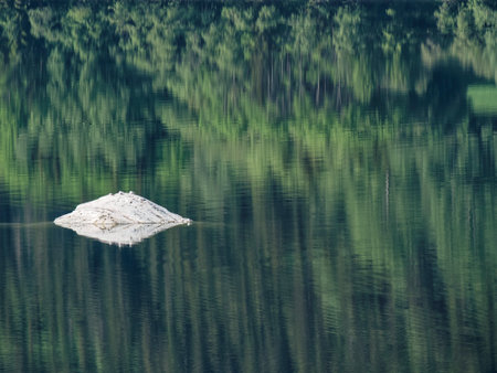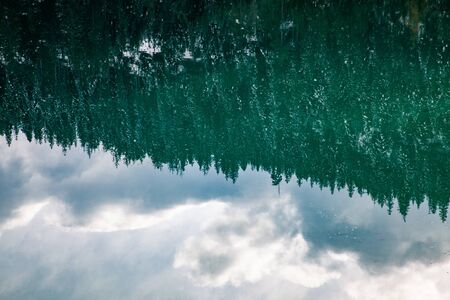 Picturesque scenery of the lake in a pine forest with a symmetry reflections in a crystal clear water. Natural mirror. Pure nature, environmental conservation, ecology. Panoramic view, copy space