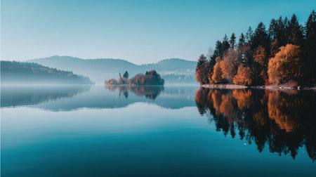This stunning autumn landscape features a tranquil lake surrounded by vibrant trees, misty mountains, and clear blue skies, creating a peaceful atmosphere for nature lovers.