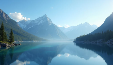 A tranquil lake surrounded by majestic snow-capped mountains, with the peaks reflected perfectly in the still water. The scene is enveloped in a soft mist, adding a sense of calm and mystery to the landscape.