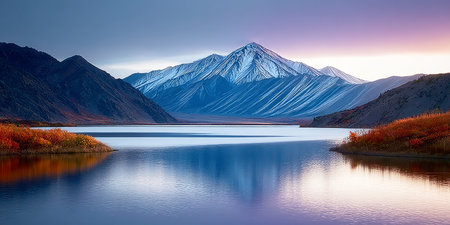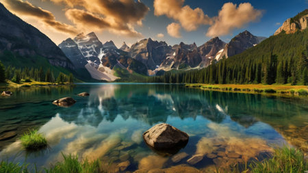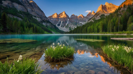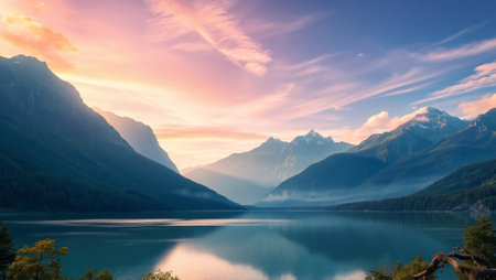 Breathtaking mountain scenery at sunrise with a calm lake reflecting the colorful sky and towering peaks. A perfect depiction of natural beauty and tranquil wilderness.