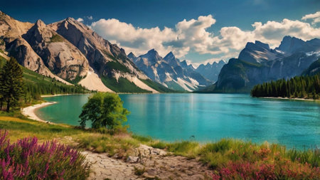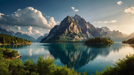 Breathtaking mountain landscape featuring a serene lake reflecting the stunning peaks and lush greenery. Ideal for nature and travel themes.