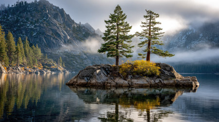 Majestic mountains and foggy clouds surround a serene lake with a small island.
