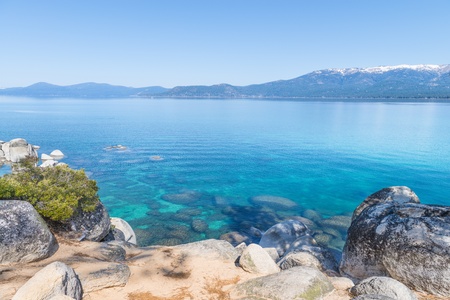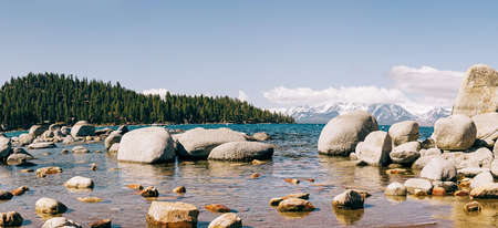 Panorama of Zephyr Cove beach on Lake Tahoe. Stones in the water and snowy mountains on the background
