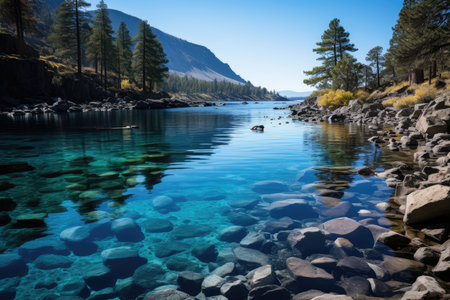 Tranquil lake tahoe scene with crystal clear blue green water revealing submerged rocks. pine trees line the shore, majestic mountains in the distance under a bright blue sky. a balanced rock cairn in the foreground.