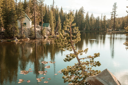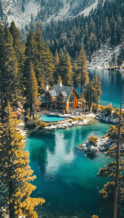 Stunning aerial view of a charming cabin on lake emerald, surrounded by pine trees and blue waters