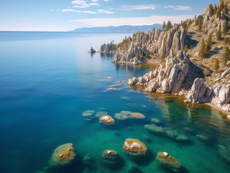 Generative AI : Nature enclosed rocky bay on sunny day with a view of sea surface turning branches green cedars and bright blue cloudless sky
