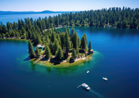 A stunning aerial view of a tranquil island retreat surrounded by crystal clear water and dense forest. This serene landscape showcases nature