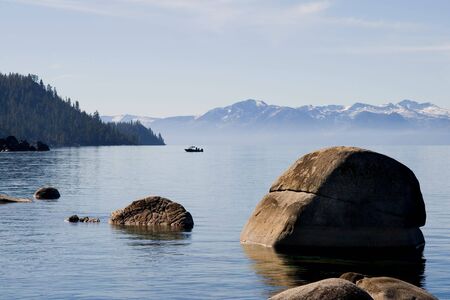 Smooth boulders and steep forested mountain slopes line the waters of Lake Tahoe