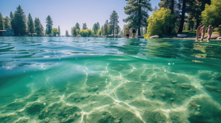 lake los mochis in california during the summer, captured with the atmospheric woodland imagery style of the nikon d850. the uhd image showcases the vibrant colors of the lake, with light turquoise and dark beige hues. the sony alpha a7 iii was used to capture the bright primary colors and iconic americana imagery. ai generated