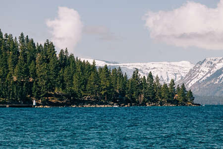 Peaceful calm landscape with fir trees and snowy mountains on the background, Lake Tahoe, California