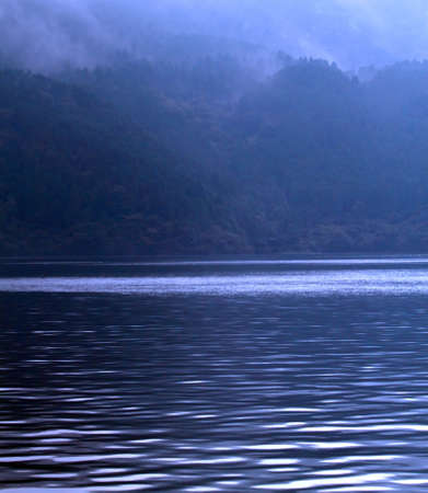 View of Lake Ashi (elev. 723 m / 2,372 ft) in Hakone mountains as seen from summit of Mt. Kintoki (elev. 1,212 m / 3,976 ft) in Shizuoka Prefecture, Japan.