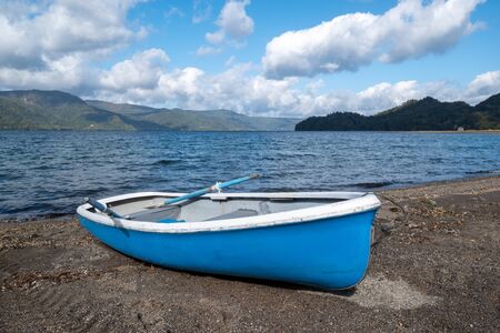 Aomori, Japan - May 16, 2017. A tourist ferry running on Lake Towada in Aomori, Japan. Lake Towada is the largest caldera lake on Honshu, Japan main island.