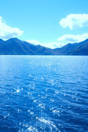 Beautiful view from Lake Towada lakeside pier, clear sky with blue water and white cloud in sunny day during autumn foliage season.