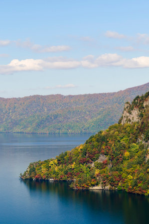 Beautiful scenery of lake and mountains in autumn. Lake Towada, Aomori, Japan