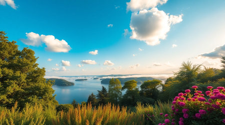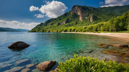 A tranquil lake scene with vibrant blue water is beautifully framed by lush forest greenery, evoking a sense of peace and natural beauty. Nature settings and relaxation themes. Bled, Slovenia.