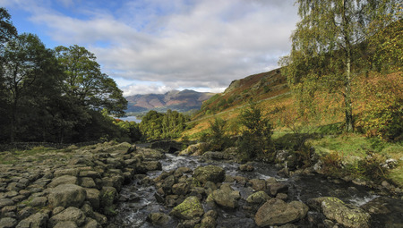 Scenic view of Watendlath Beck or river in Lake District National Park, Cumbria, England.
