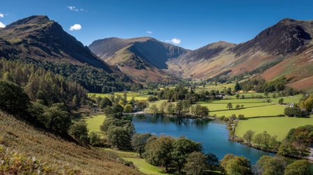 Witness nature's masterwork unfold in the picturesque splendor of the Lake District, where tranquil lakes, rugged mountains, and idyllic villages harmonize in a captivating tapestry that showcases the UK's most scenic landscapes. AI-generated