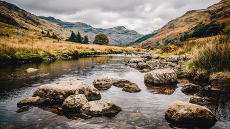 A peaceful stream winds through a rocky landscape, framed by towering mountains and vibrant fields, capturing the serene beauty of nature under a cloudy sky.