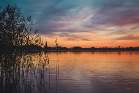 Beautiful sunset over calm lake. Colorful and vibrant landscape of lake shore with reeds. Tranquil landscape useful as background